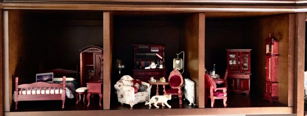 Would you like to see where I write? This is my desk… and where I keep my dollhouse rooms. I don’t actually have a dollhouse. We are condo dwellers, and Mr. Johns can’t be convinced to sacrifice the space for it yet, but this is a little introductory video of how it all comes together.