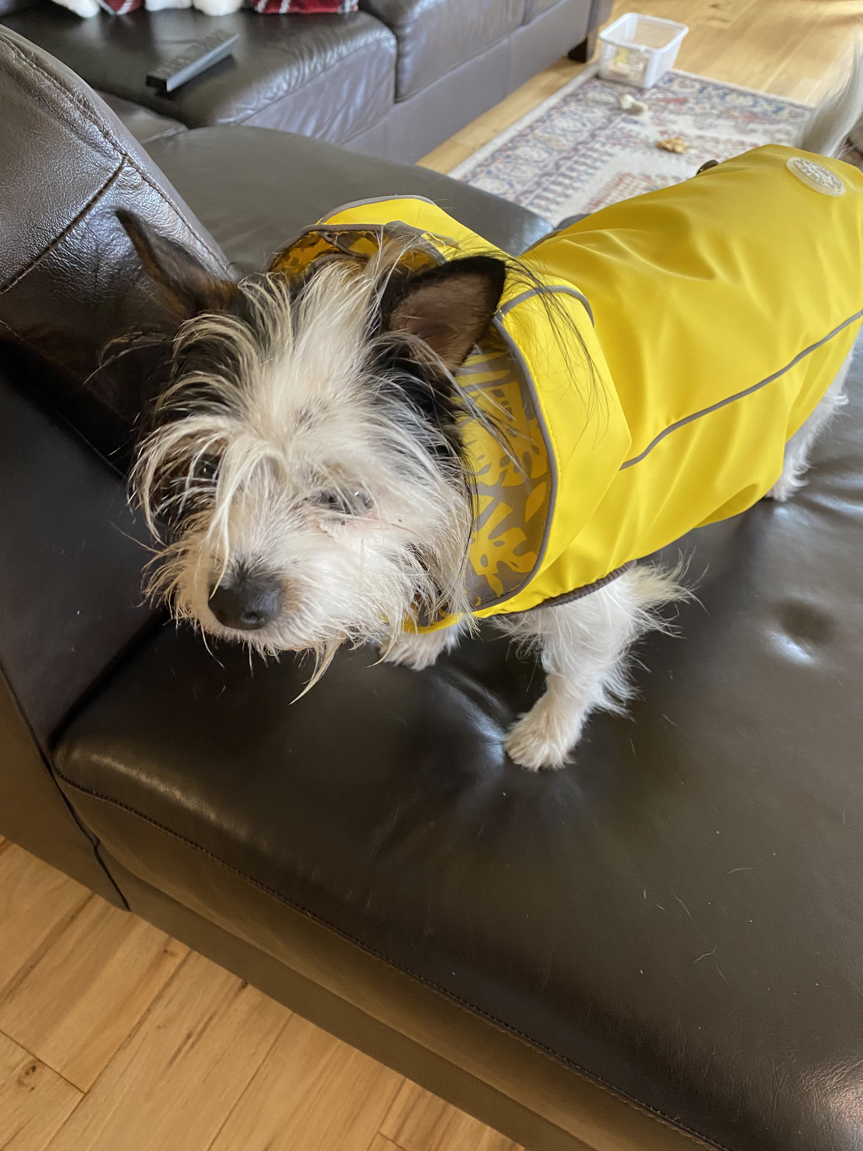 This is Molly in her little raincoat. It had been pouring all week, and she was downright annoyed with the fact that A. she got wet when she went out to do her business, and B. she had to wear a raincoat to stay somewhat dry.