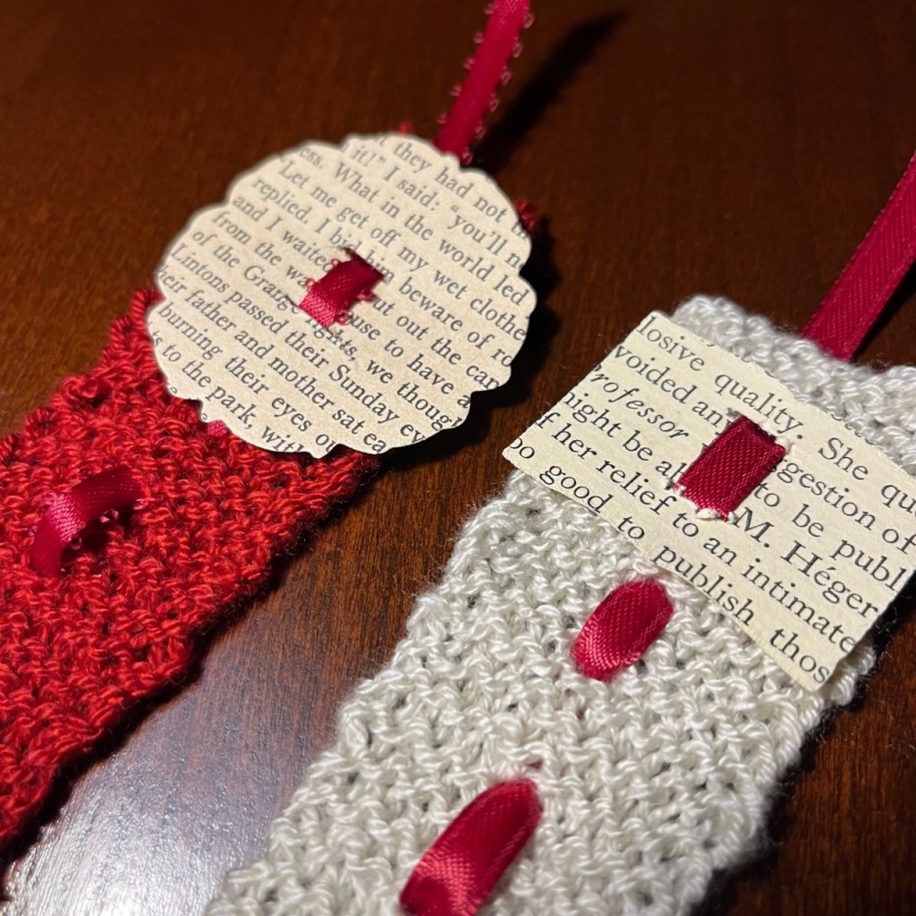 I love making my sweet little knitted bookmarks. I get to play with different colors of yarn and ribbon, but during the Christmas season, I’m always drawn to the Christmas colors. There’s something special about a handmade bookmark, isn’t there? And each one is knitted with love by Yours Truly!
