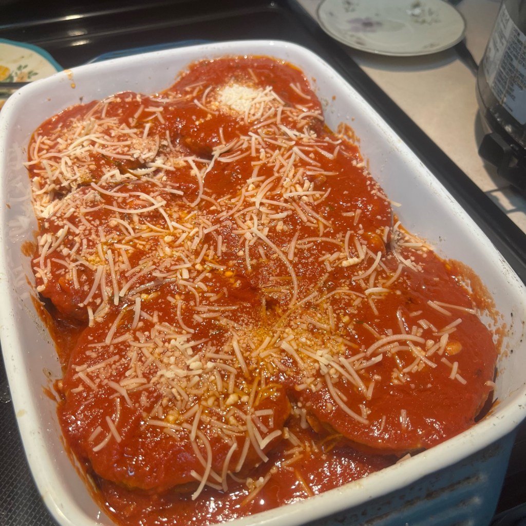 Add some parmesan cheese, or even a nice layer of mozzarella on top of the dish, cover with tin foil, and put in the oven at 375F for about 40 minutes.