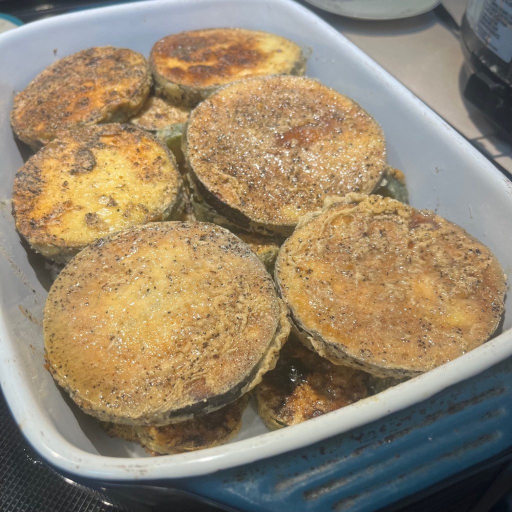 First, you want to fry up your eggplant and zucchini and layer them in a baking dish. Slice the eggplant as thick as you like. I like them about as thick as a penny’s face. (1 cm). Dip them in egg, then in the cornstarch, and fry them in a pan at medium head until they are golden brown on both sides.