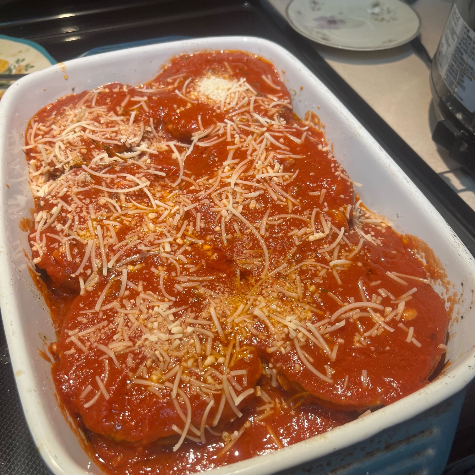 First, you want to fry up your eggplant and zucchini and layer them in a baking dish. Slice the eggplant as thick as you like. I like them about as thick as a penny’s face. (1 cm). Dip them in egg, then in the cornstarch, and fry them in a pan at medium head until they are golden brown on both sides.