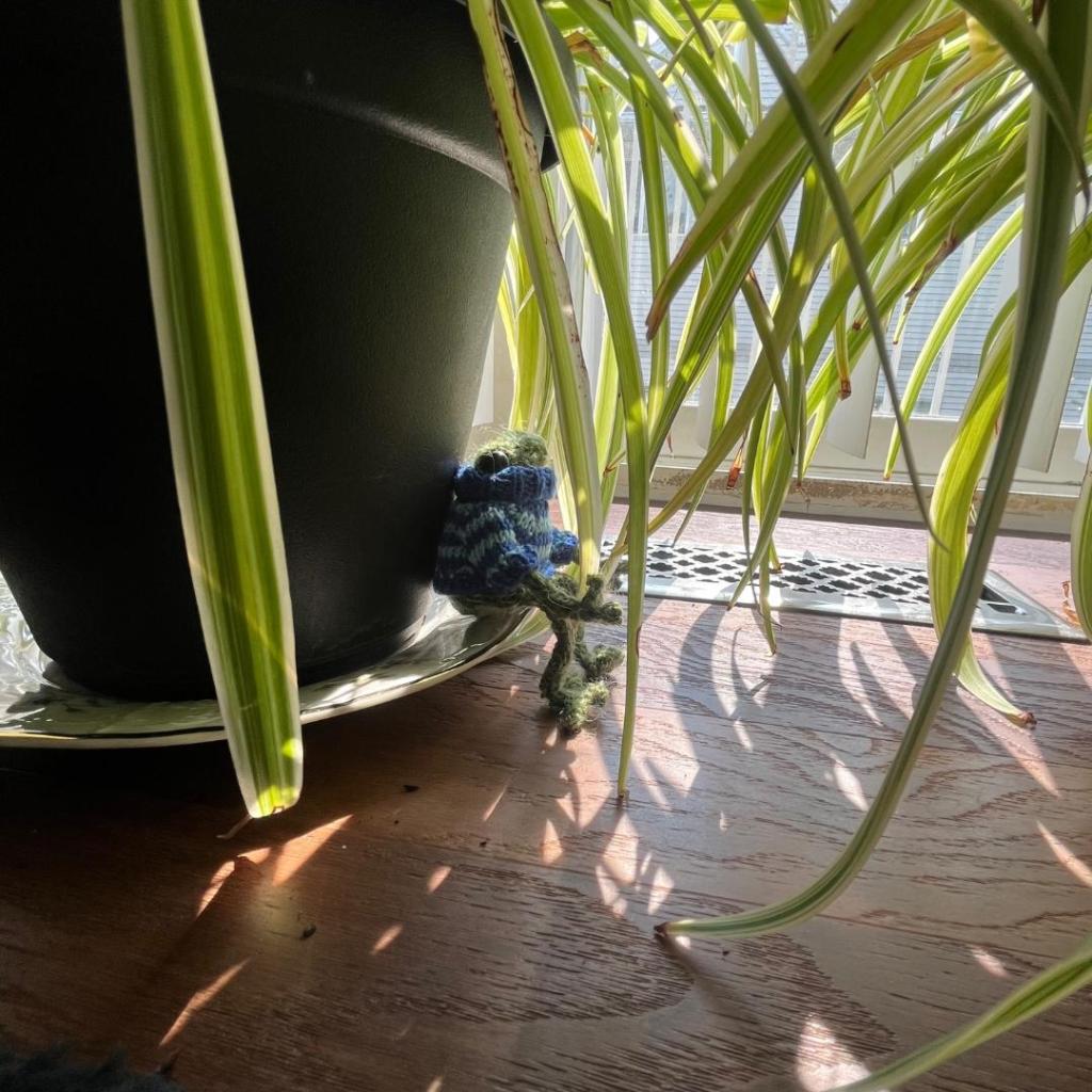 Now, George is sitting outside, under the potted plant, thinking sad and dismal thoughts about Amelia’s fondness for a toad who looks terrible for a toad his age, in George’s humble opinion.