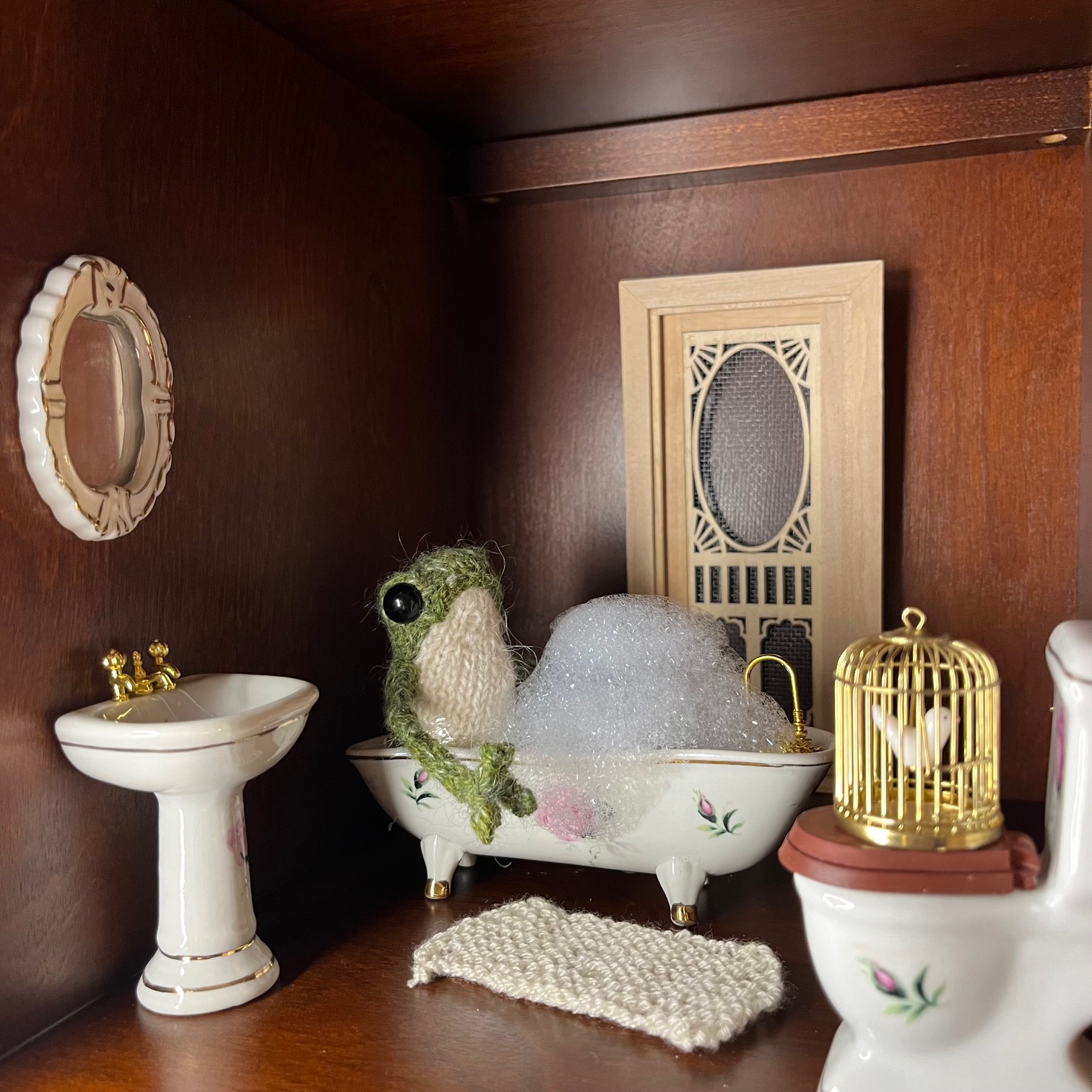 George sat in the tub amidst his piles of bubbles. It was a lovely evening, and Amelia had brought Polly into the nice steamy bathroom so that Polly wouldn’t be alone. She had been very noisy and squawky lately, and Amelia was concerned about her bothering the neighbours.