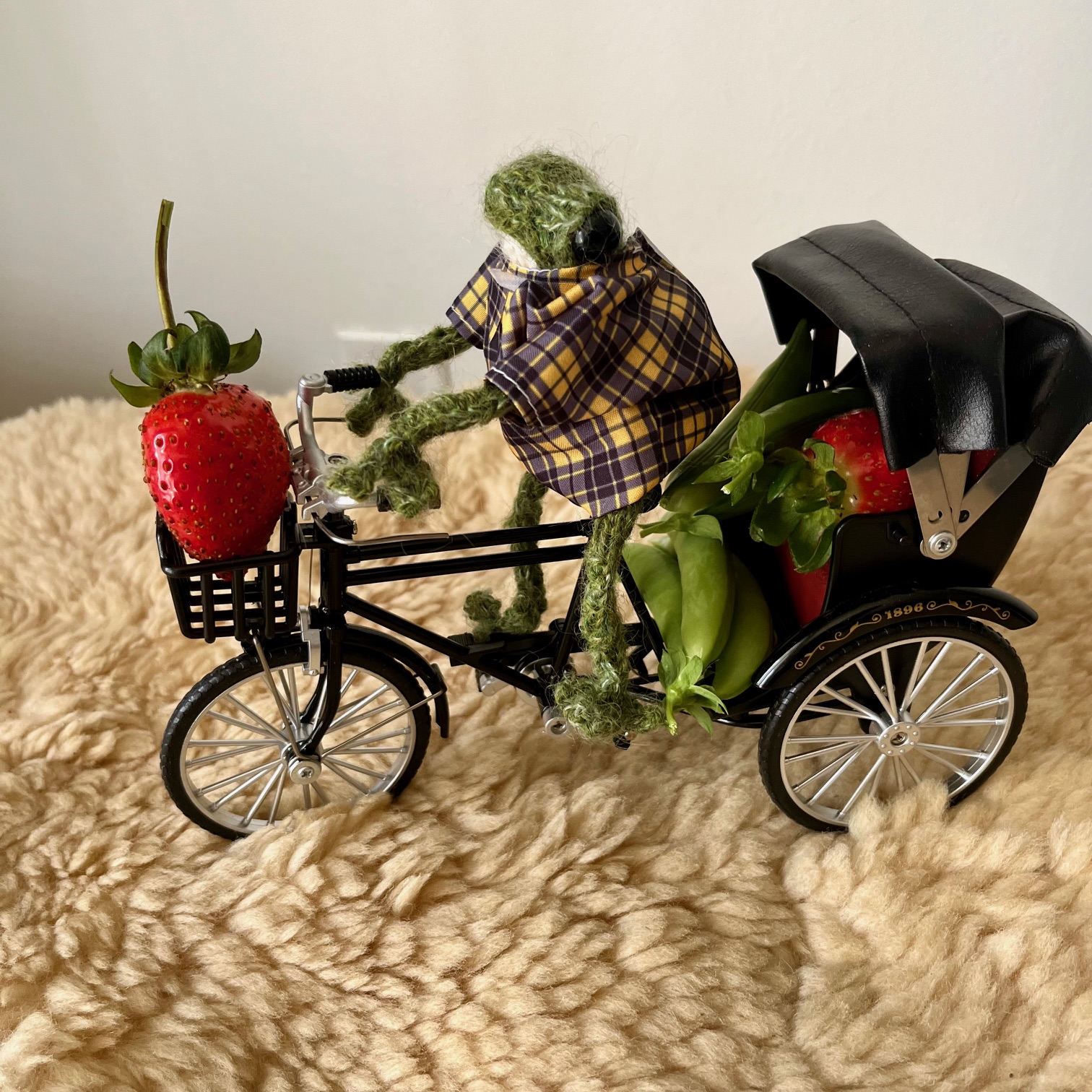 George took his bike out to the garden to pick what was ready to be picked. It was a a very productive morning! There were several pods of peas that were plump and ready, and when he rifled through the dense strawberry leaves, he came upon some lovely red berries.