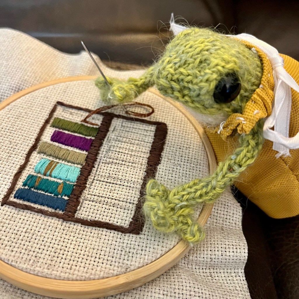 So Amelia decided to pull out an old embroidery project that she’d started ages ago. It was a bookshelf with an array of different coloured books, and it just made Amelia feel happy to look at it. So she pulled out her embroidery thread and a needle, and she got to work.