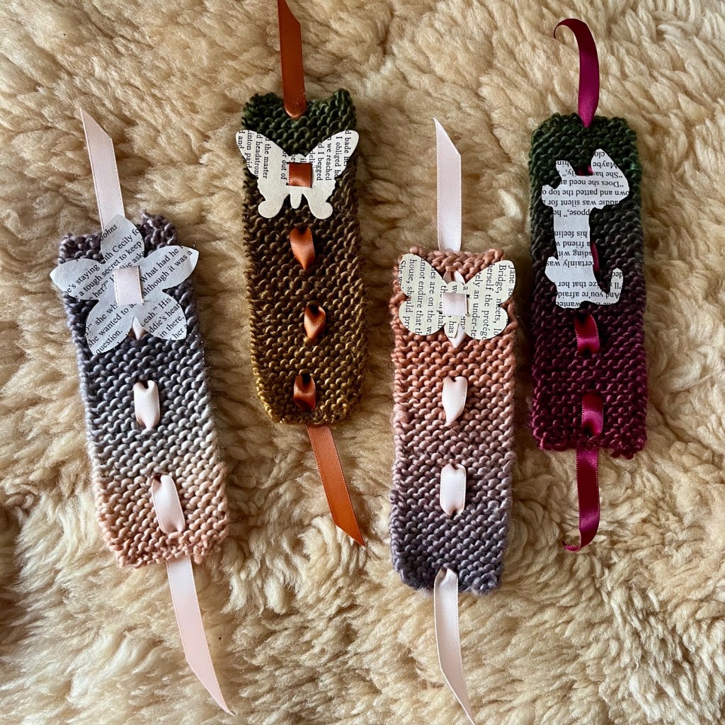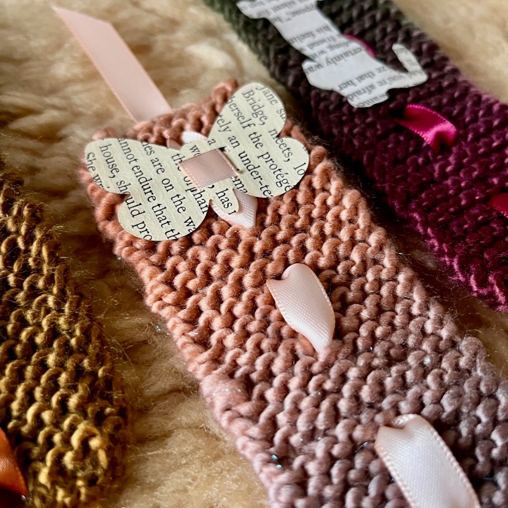 I love knitted bookmarks. They’re just fun to make! There is something very relaxing about soft, colourful yarn and pretty ribbons that just hits my brain right in the pleasure centre.