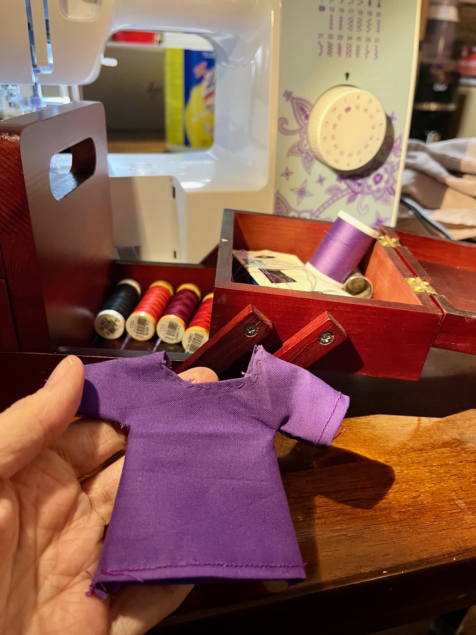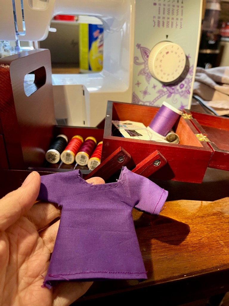 First I had to knit her onto a wire frame so that she’s posable, and then attach her hands and feet. And then, I needed to make her some clothes! And this Christmas, I pulled out my sewing machine and made her a little purple Amish dress and white apron.