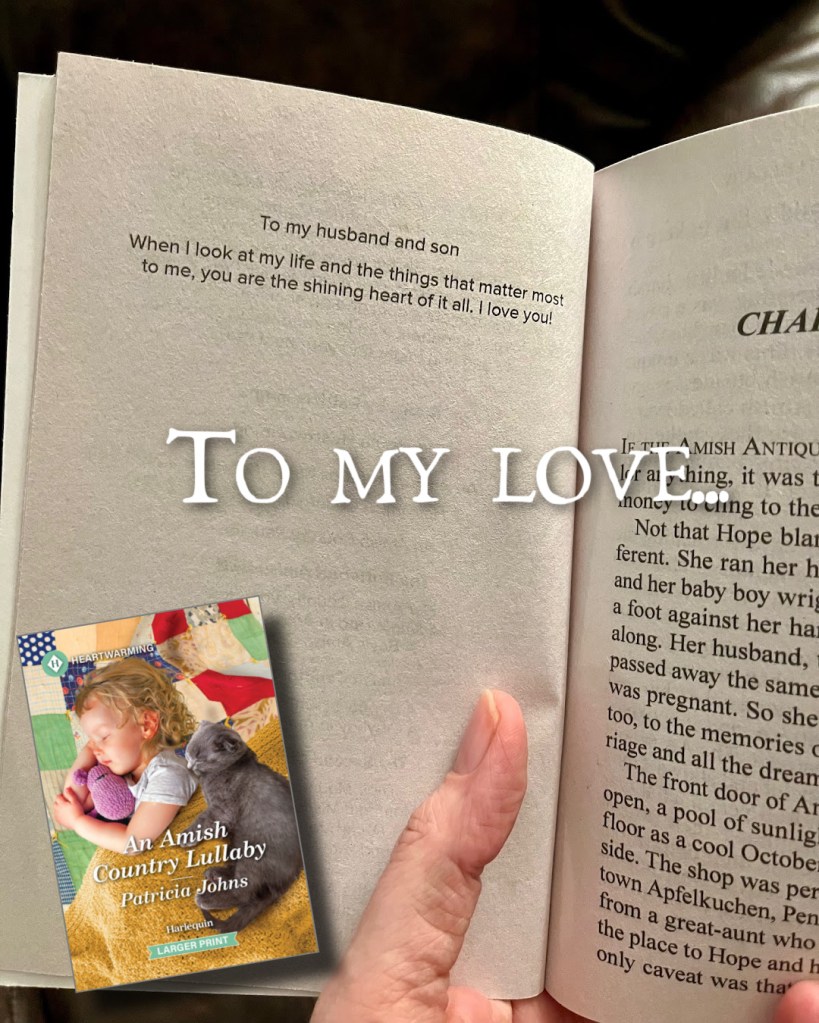 Now, both my husband and my son have gotten used to this state of affairs. When one of my books comes out, I get my box of books, and I show them the dedication. They like it, don’t get me wrong, but the newness of it has worn off. They simply expect it. Of course, my books will be dedicated to them.