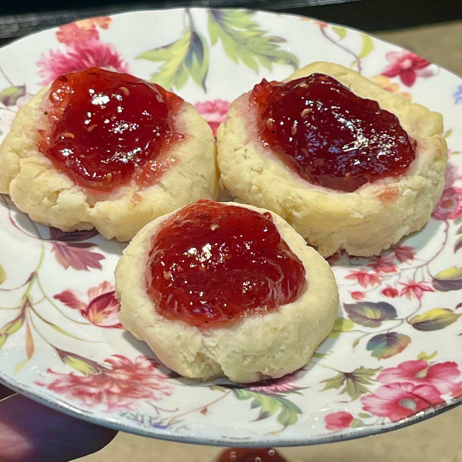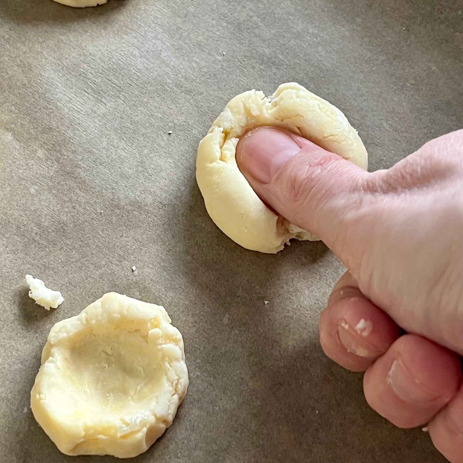 Roll up a small ball of pie crust. Put a thumb print in the center, and fill it with jam.